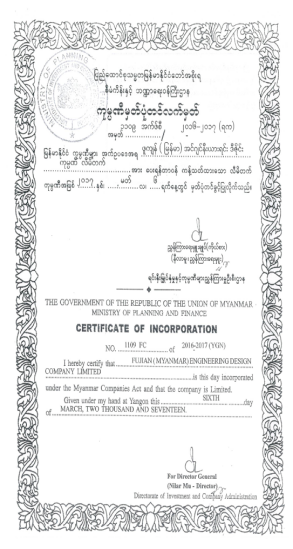 2017年3月6日,經(jīng)過中國駐緬甸大使館和緬甸各級領(lǐng)導(dǎo)的大力支持和幫助下,我公司在緬甸仰光成立了權(quán)屬子公司——福建(緬甸)工程設(shè)計有限公司,該公司位于仰光市NO.43,MoeSwe Street,No(14) Ward, South Okkalapa Township,是一家專業(yè)從事規(guī)劃、建筑、市政設(shè)計的工程設(shè)計機構(gòu)。自2009年起至今我公司陸續(xù)在緬甸承接了內(nèi)比都國家體育館和游泳館、總統(tǒng)府國宴廳、三軍檢閱臺、仰光United體育場等大型民用建筑設(shè)計以及仰光新城的修建性規(guī)劃設(shè)計和市政工程設(shè)計。福建(緬甸)工程設(shè)計有限公司的成立,是我公司響應(yīng)中國“一帶一路”建設(shè)號召,積極拓展海內(nèi)外業(yè)務(wù)的一次重要戰(zhàn)略部署,不僅為公司多元化發(fā)展邁出了關(guān)鍵性的一步,而且將為緬甸社會群眾提供優(yōu)質(zhì)的工程設(shè)計服務(wù),是我公司在東南亞周邊國家設(shè)置分支機構(gòu)的一個重要里程碑。