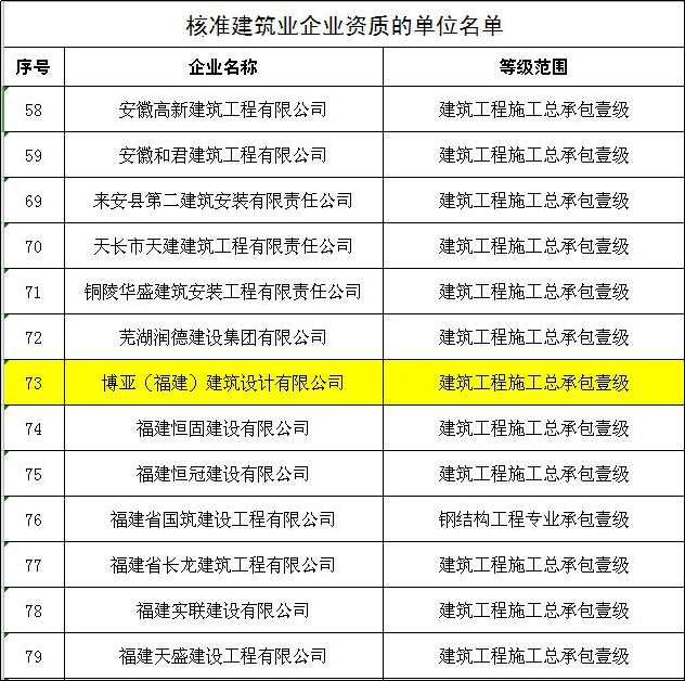 日前,由住建部核準(zhǔn)的2021年第三批建設(shè)工程企業(yè)資質(zhì)名單正式公布,博亞(福建)建筑設(shè)計有限公司通過住建部“建筑工程施工總承包壹級”資質(zhì)審批,這是繼福建省建筑設(shè)計研究院之后,福建省獲批的第二家工程設(shè)計企業(yè)。