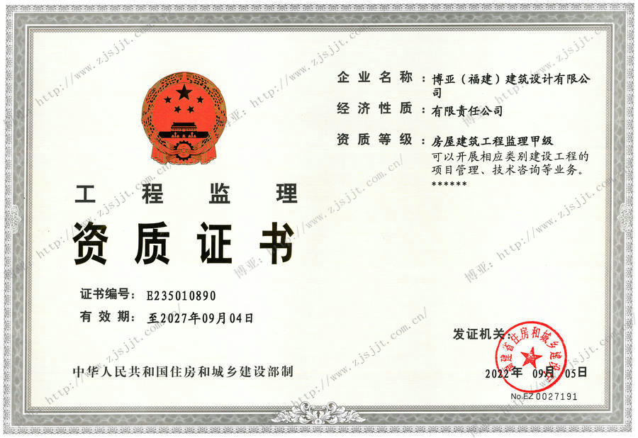 金秋九月,博亞(福建)建筑設(shè)計(jì)有限公司經(jīng)福建省住建廳審查批準(zhǔn)取得工程監(jiān)理房屋建筑工程甲級資質(zhì),公司現(xiàn)有資質(zhì)已從建筑工程總承包壹級、建筑行業(yè)設(shè)計(jì)甲級、市政行業(yè)設(shè)計(jì)乙級等拓展到工程監(jiān)理甲級,主營業(yè)務(wù)也在工程設(shè)計(jì)、施工總承包和海外投資的基礎(chǔ)上延伸至工程監(jiān)理版塊。監(jiān)理資質(zhì)的取得,不僅有助于公司多元化發(fā)展,而且為開展全過程工程咨詢管理服務(wù)奠定了堅(jiān)實(shí)的基礎(chǔ),標(biāo)志著博亞公司將成為多版塊協(xié)同發(fā)展的綜合性建筑企業(yè)。