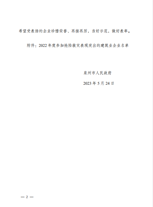 近日,泉州市人民政府發(fā)布《關(guān)于表揚(yáng)2022年泉州市參與搶險救災(zāi)表現(xiàn)突出的建筑企業(yè)的通報》,博亞(福建)建筑設(shè)計有限公司榜上有名,這是公司繼2022年榮獲泉州市“企業(yè)社會責(zé)任獎”之后因主動承擔(dān)社會責(zé)任,主動參與搶險救災(zāi)等工作受到政府的通報表揚(yáng)。