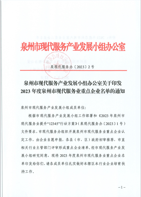 “現(xiàn)代服務(wù)業(yè)重點(diǎn)企業(yè)”是泉州市現(xiàn)代服務(wù)辦為進(jìn)一步貫徹落實(shí)市委、市政府“強(qiáng)產(chǎn)業(yè)、興城市”雙輪驅(qū)動(dòng)發(fā)展戰(zhàn)略部署,更好地促進(jìn)當(dāng)?shù)胤?wù)業(yè)發(fā)展,根據(jù)發(fā)展小組牽頭市領(lǐng)導(dǎo)的要求,擬組織認(rèn)定的項(xiàng)目。